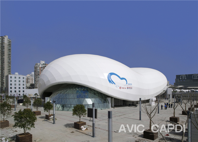 L'idée de conception inspire de l'image intégrale de la forme du nuage et de l'avion. La superficie du batiment se couvre par des matériaux de PVC blanc avec le système de support d'espace structurale. La longueur du pavil